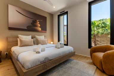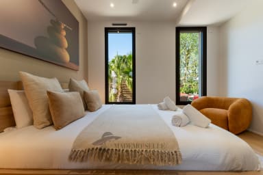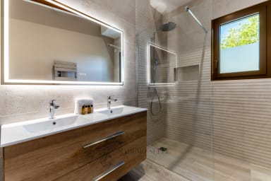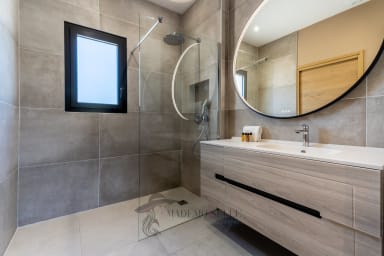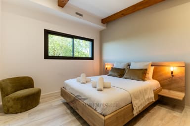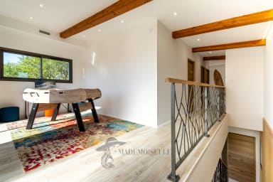 The villa features 3 bedrooms: a beautiful ground-floor master bedroom in a step-free living area (except pool access), and upstairs 2 bedrooms, 1 bathroom, a game area with foosball and a small terrace. The spacious open-plan living room and kitchen enhance shared moments, while outside, the private non-heated pool, pétanque court, BBQ and garage complete the experience.