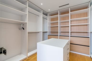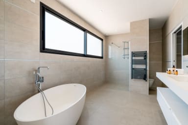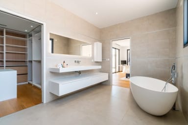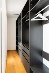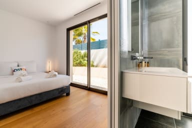 La suite principale offre un lit king size (180 cm), un immense dressing, une salle de bain privative avec baignoire, douche à l’italienne et double vasque, ainsi qu’un bureau avec vue sur la piscine.
