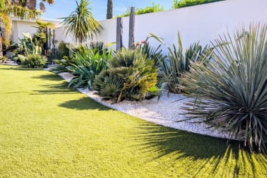 Le jardin paysager soigneusement entretenu entoure la piscine privative, le salon d’été, et un coin détente avec transats, parfait pour les bains de soleil. Un petit potager d’herbes aromatiques est également à disposition pour relever vos plats.