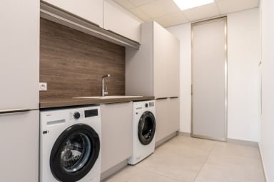 Une buanderie, un garage fermé, un parking privé pour 6 véhicules (3 sans manœuvre), ainsi que la climatisation, une alarme, et des panneaux solaires viennent compléter les équipements de cette villa écoresponsable.