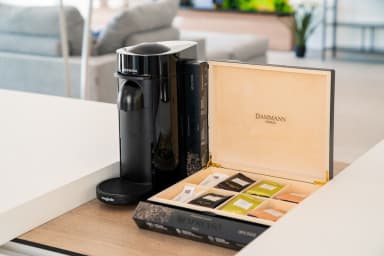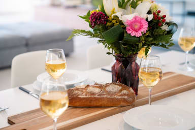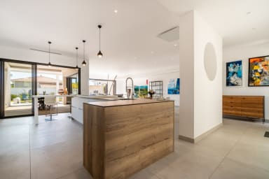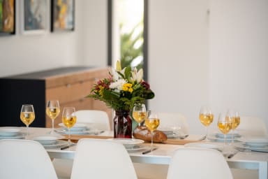 Le salon XXL s’ouvre sur une vaste pièce baignée de soleil, avec un canapé ultra confortable, idéal pour se détendre après une journée plage ou marché. La cuisine américaine ouverte, au style épuré et entièrement équipée, permet un accès direct à l’espace plancha extérieur : un vrai bonheur pour cuisiner sous les étoiles ou partager des repas conviviaux en terrasse.