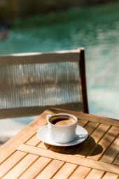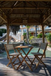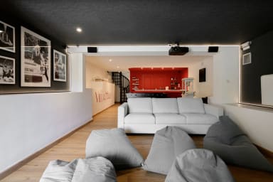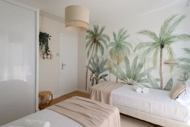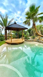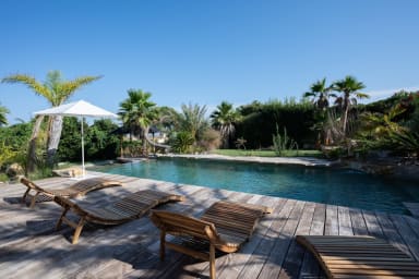 L’extérieur est une invitation au lâcher‑prise : jardin paysager où les palmiers caressent le ciel et piscine lagon (chauffage sur demande de mai à fin septembre). Les soirées se prolongent dans la salle de cinéma avec bar ; la villa privilégie la tranquillité et n’autorise pas les festivités bruyantes, par respect pour le voisinage.