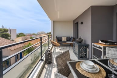 Idéal pour une pause détente ! Terrasse avec vue mer. 1 chambre + canapé‑lit, jusqu’à 4 voyageurs. Commerces à proximité, plage à 10 min à pied. Intérieur soigné et entièrement meublé. Résidence sécurisée. Place de parking en sous‑sol : accès avec manœuvres, plutôt adaptée aux véhicules compacts.