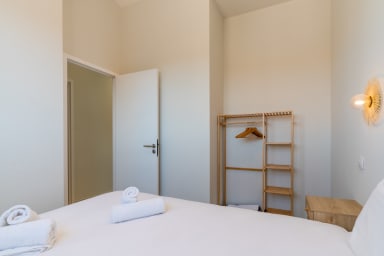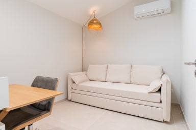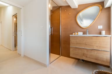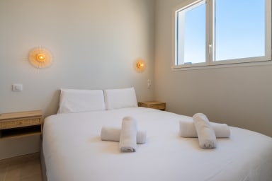 Côté nuit, l’organisation privilégie la fluidité : au rez-de-chaussée, une suite avec salle d’eau privative. À l’étage, trois chambres : une grande suite avec fenêtre panoramique tournée vers la plage (vue mer depuis le lit), une chambre double au style épuré, et une chambre bureau pensée pour le télétravail, dotée d’un canapé-lit avec véritable matelas pour un couchage confortable. Rangements et matières douces prolongent le repos.
