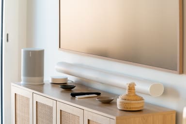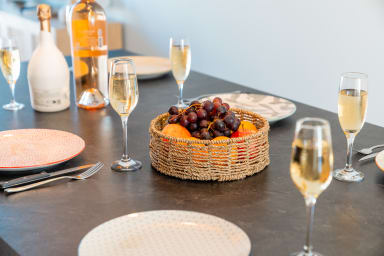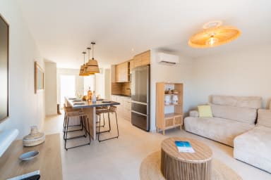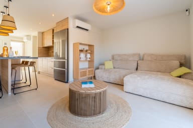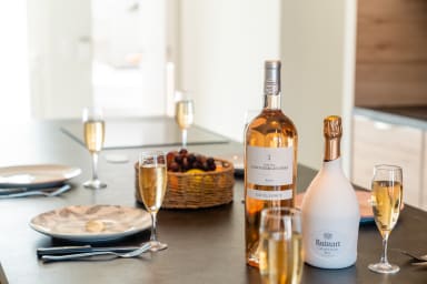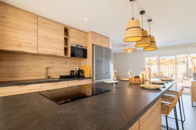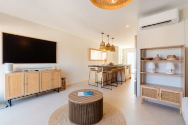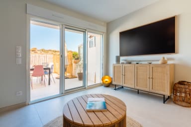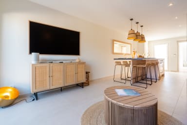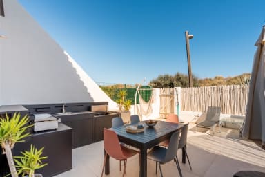 La pièce à vivre rassemble tout le monde autour d’un grand îlot : cuisine entièrement équipée pour improviser ou recevoir, salon confortable avec Samsung Frame 65" et barre de son Sonos. Dehors, la cuisine d’été aligne plan de travail, plancha et barbecue ; la terrasse de 30 m² accueille transats et grandes tablées pour bronzer, lire ou partager un repas.