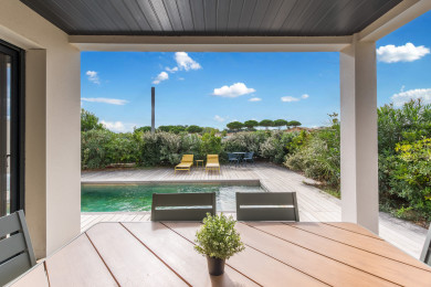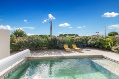 À l’extérieur, la villa offre un art de vivre méditerranéen : piscine privée, terrasse soignée pour les repas en plein air, et cette sensation de vacances “sans effort”. La plage est accessible à pied en environ 10 minutes (900 m), un vrai luxe au quotidien quand on est en famille : moins de logistique, plus de liberté.